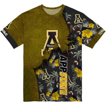 Are you ready to turn heads with this Customized Appalachian State Mountaineers Tropical Scene Gold T-Shirt? Yeah! You can show your team spirit excitingly and cheerfully with this NCAA T-shirt. The front logo proudly indicates your support for the team, and the back logo, which is bigger and made very well to make a statement, makes you feel even more passionate. This shirt is made to stand out and is both stylish and comfortable. For sure, it’s the best way to show how much you love the game!
