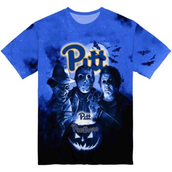 Are you ready to turn heads with this Pittsburgh Panthers Horror Icons Royal Blue Black T-Shirt? Yeah! You can show your team spirit excitingly and cheerfully with this NCAA T-shirt. The front logo proudly indicates your support for the team, and the back logo, which is bigger and made very well to make a statement, makes you feel even more passionate. This shirt is made to stand out and is both stylish and comfortable. For sure, it’s the best way to show how much you love the game!