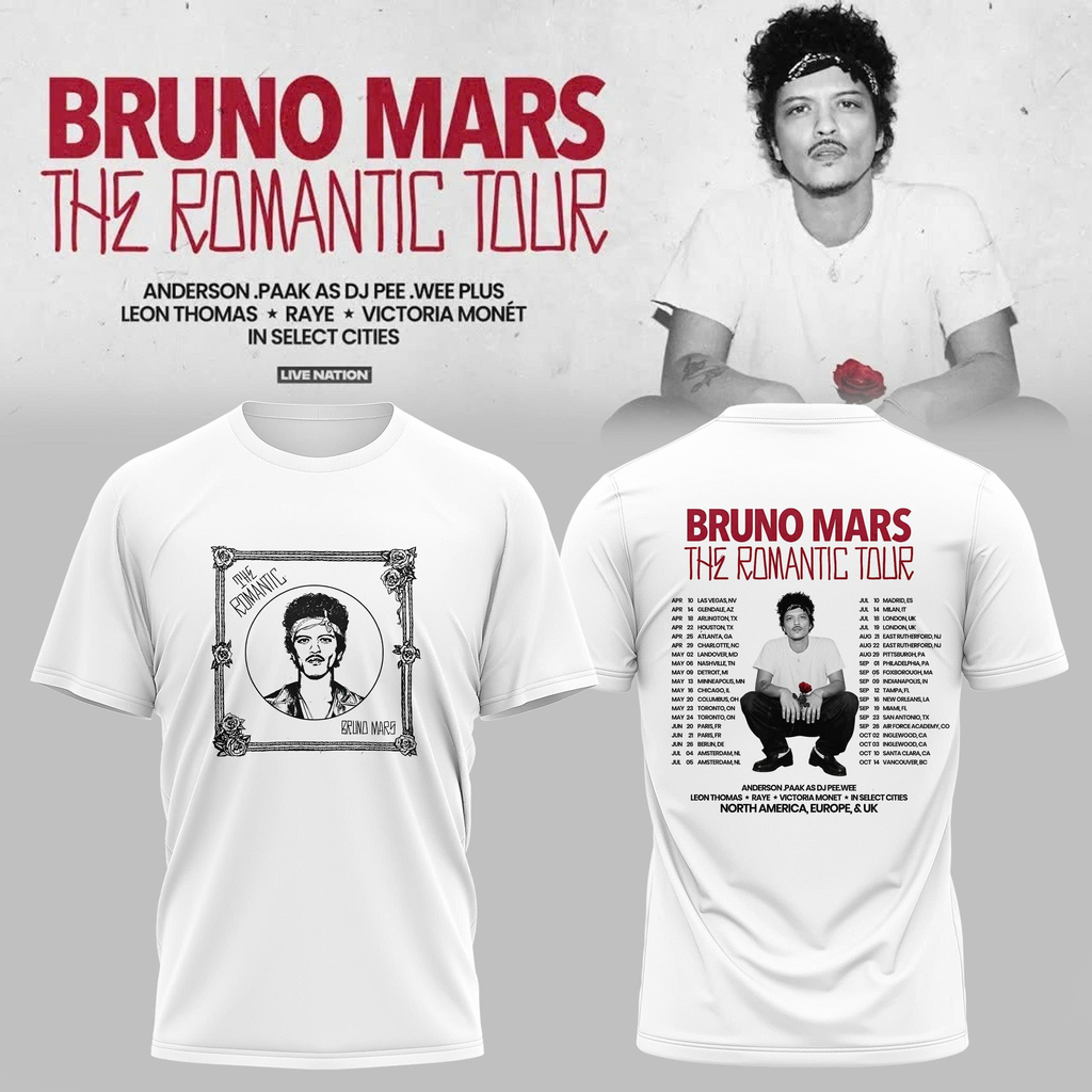Bruno Mars The Romantic Tour 2026 White T-Shirt Official Merch Best Gift For Music Fans.