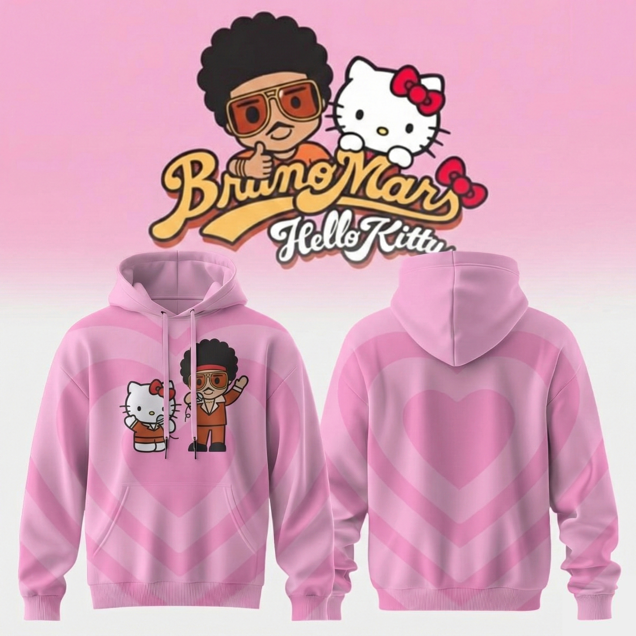 Bruno Mars x Hello Kitty Heart Pink Hoodie Bruno Mars Merch Unique Gift For Music Lovers.