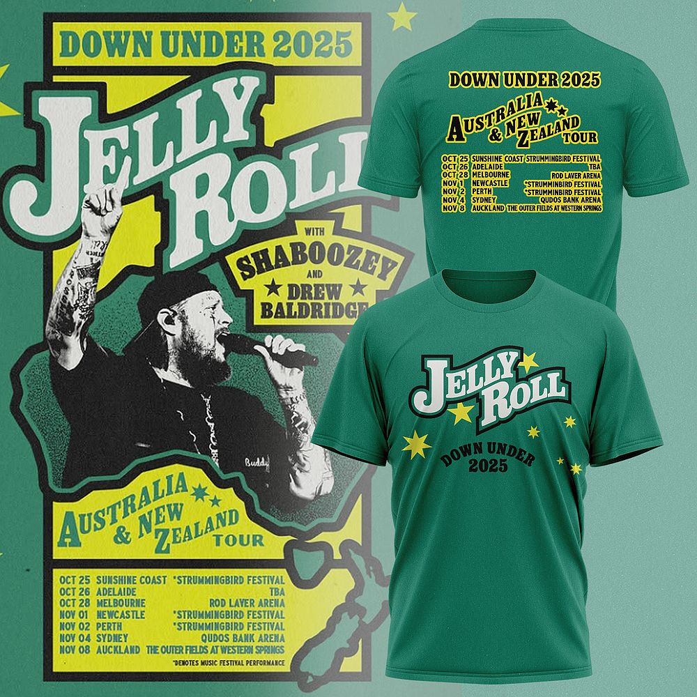 Jelly Roll Down Under 2025 Australia New Zealand Tour T-Shirt Concert Merch.