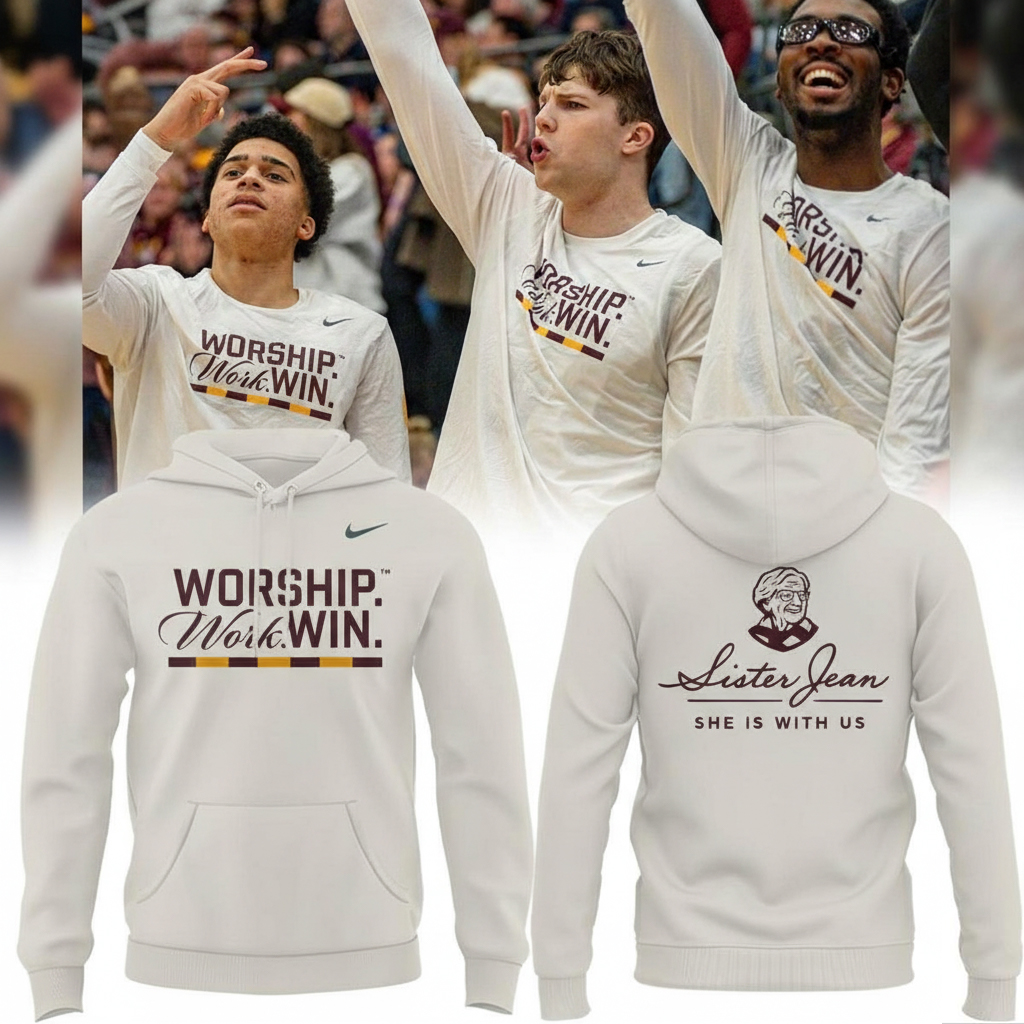 Loyola Basketball Worship Work Win Sister Jean Hoodie Loyola Merch Unique Gift For College Fans.