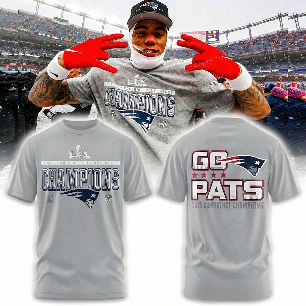 New England Patriots AFC Champions Locker Room Trophy 2025 T-Shirt Football NFL Merch Best Gift For Football Fans.