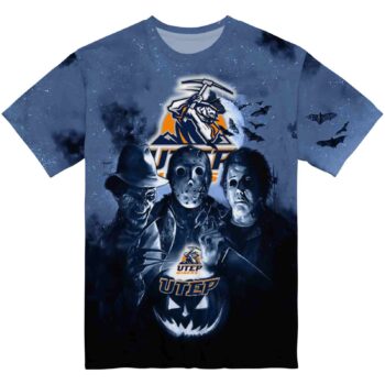 Are you ready to turn heads with this UTEP Miners Horror Icons Blue Black T-Shirt? Yeah! You can show your team spirit excitingly and cheerfully with this NCAA T-shirt. The front logo proudly indicates your support for the team, and the back logo, which is bigger and made very well to make a statement, makes you feel even more passionate. This shirt is made to stand out and is both stylish and comfortable. For sure, it’s the best way to show how much you love the game!